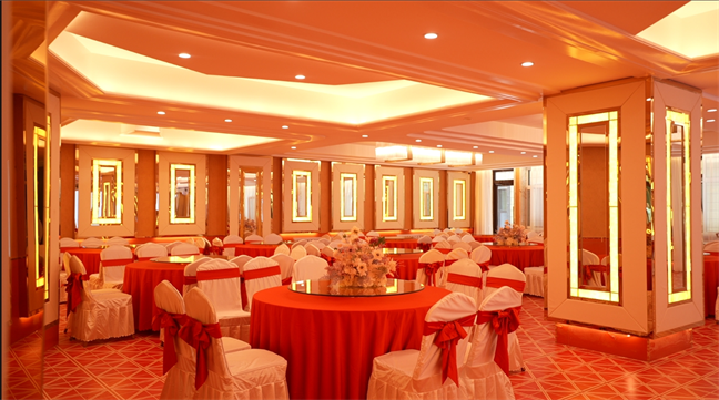 月亮廳—面積249㎡,此廳選用移動吧臺 及移動音控設備,可擺放12張1.8米的宴會桌。